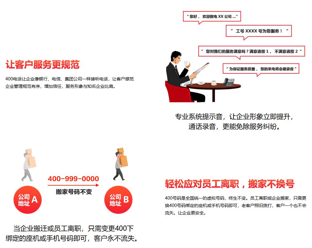 400电话是绑定在你原有的任何运营商的固定电话、手机上(类似呼叫转移),而不需要另外迁入电信或者联通的线路。可以同时支持20门以上的电话,通过顺序呼转、随机呼转、循环呼转、语音导航(类似中国电信10000;业务咨询请按1;技术支持请按2;售后服务请按3……)转接至客户想要的客服专员上,以第一时间解决客户的咨询、疑难。